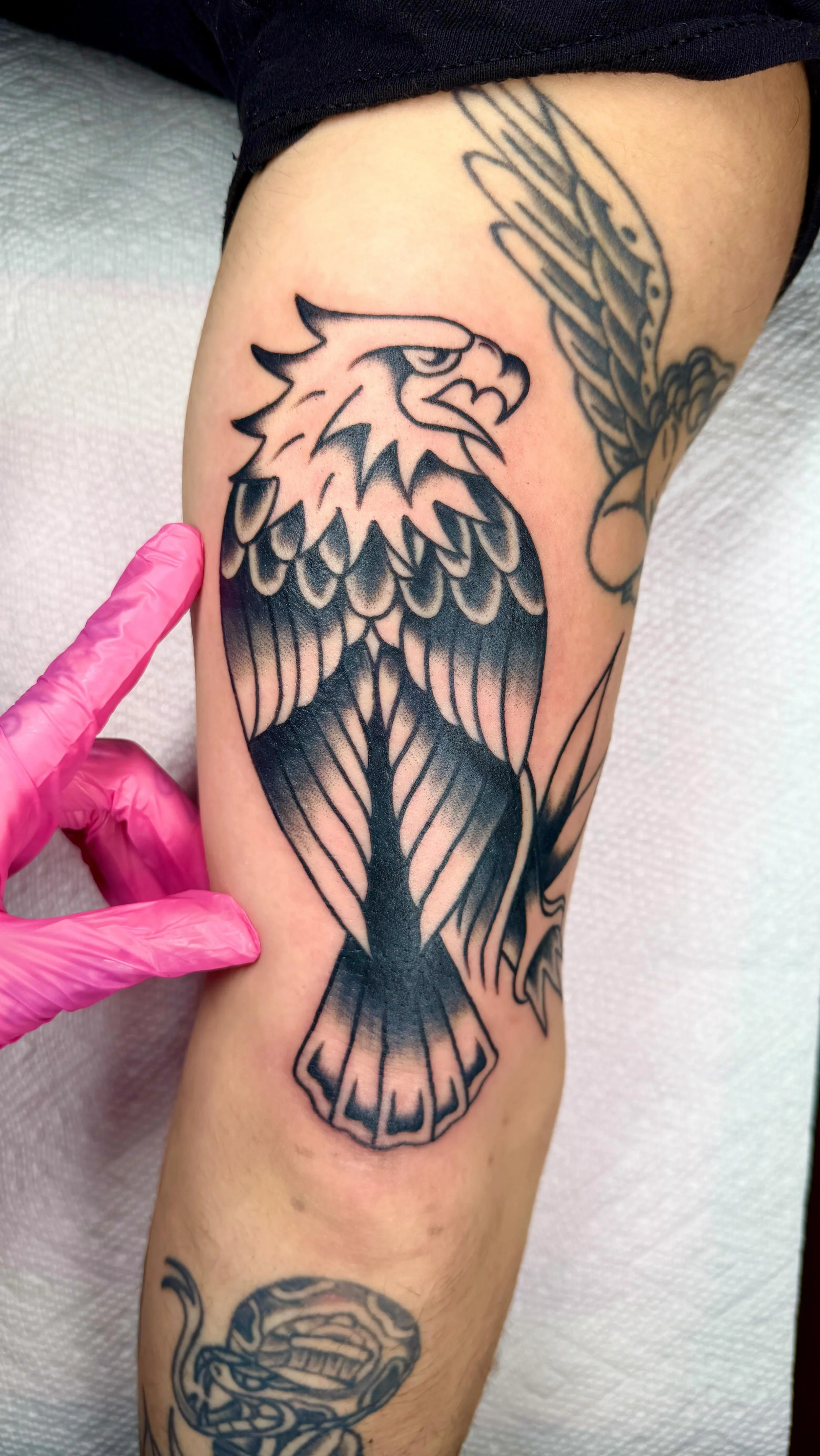 I specialize in traditional American tattoos, a style known for its bold lines, vibrant colors, and timeless appeal. It’s a style that speaks for itself, with designs like eagles, panthers, snakes, peonies, and roses that carry meaning and personality. Check out my portfolio here to see specifically what I do. Of come to the tattoo shop where you can see paintings decorating the walls with all my designs!